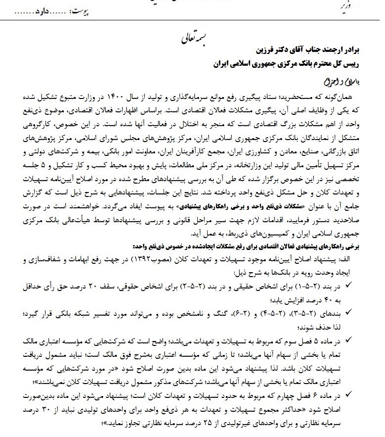 نتایج این جلسات پیشنهادهایی به شرح ذیل است که گزارش جامع آن با عنوان مشکلات ذینفع واحد و برخی راهکارهای پیشنهادی به پیوست ایفاد میگردد، خواهشمند است در صورت صلاحدید دستور فرمایید اقدامات لازم جهت سیر مراحل قانونی و بررسی پیشنهادها توسط هیأت عالی بانک مرکزی جمهوری اسلامی ایران و کمیسیونهای ذی ربط به عمل آید.