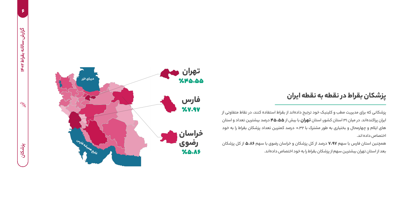 این گزارش امکان رصد رشد و توسعه سلامت دیجیتال را نیز فراهم کرده است. سهم 45.55 درصدی پزشکان تهران در بررسی نقطه به نقطه استفاده از مدیریت مطب و کلینیک نیز یک بار دیگر تاکیدی بر تراکم پزشکان در پایتخت است. این شاخص یک بار دیگر نگرانی درباره مرکزگرایی را تشدید می‌کند.