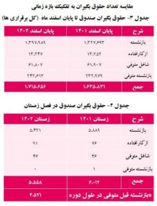 تعداد کل حقوقبگیران صندوق تا پایان فصل زمستان سال ۱۴۰۲ نسبت به زمان مشابه سال قبل به میزان ۵ درصد افزایش داشته است. بازنشسته قبل متوفی در فصل زمستان، منظور بازنشستگان و از کار افتادگانی است که قبلا بازنشسته و در فصل زمستان فوت شدهاند؛ در فصل زمستان ۴۵۲۱ نفر از حقوقبگیران فوت شدهاند که همه آنها قبل از این فصل بازنشسته شدهاند