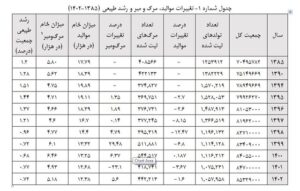 رئیس موسسه تحقیقات جمعیتی کشور تصریح کرد: به همین منوال، میزان خام موالید از حدود ۲۰ در هر هزار نفر جمعیت در سال ۱۳۹۴ با شیب زیاد در آغاز دوره و با شیب کم در سالهای اخیر به ۱۲.۳۸ در هر هزار نفر جمعیت در سال ۱۴۰۲ رسید و متوسط نرخ رشد جمعیت از ۳.۷ درصد در فاصله سالهای ۱۳۵۵ تا ۱۳۶۵ به ۱.۲۴ درصد در فاصله سالهای ۱۳۹۰ تا ۱۳۹۵ کاهش یافت. در نتیجه این روندها، نرخ رشد طبیعی جمعیت، در سال ۱۴۰۲ با شیبی کاهنده به حدود ۰.۷ درصد رسیده است.