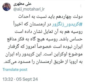 جمهوریت-علی مطهری نماینده ادوار مجلس در توییتی نوشت: دولت چهاردهم باید نسبت به احداث کریدور زنگزور در ارمنستان که اخیراً روسیه هم به آن تمایل نشان داده است حساس باشد. روسیه هیچ گاه به فکر منافع ایران نبوده است خصوصاً امروز که گرفتار موضوع اوکراین است. این کریدور راه ایران به اروپا از طریق ارمنستان را مسدود میکند.
