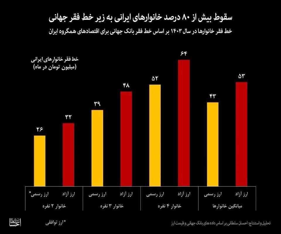 به گزارش سلامت نیوز به نقل از اقتصاد ۲۴، بر اساس خط فقر تعیین شده (بانک جهانی) برای اقتصادهای هم سطح ایران، یک خانوار سه نفره (با درآمد ریالی) در (اقتصاد دلاری) ایران به درآمد ماهانه ۴۰ تا ۵۰ میلیون تومان نیاز دارد تا فقیر محسوب نشود.