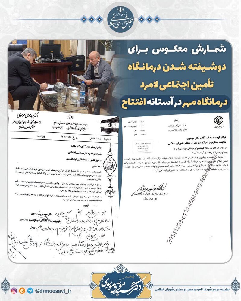 دکتر موسوی در بخش دیگری از مطالبات خود با گریزی بر تاریخچه احداث و راهاندازی *درمانگاه تأمین اجتماعی لامرد* که در دوره اول نمایندگی وی در مجلس نهم پس از پیگیریهای فراوان و با همّت خیراندیش ارجمند «حاج شیخحبیب کاظمی» به ثمر رسیده بود، خواستار تخصیص برخی تجهیزات پزشکی ازجمله دستگاههای عکسبرداری تمامفک (OPG)، سونوگرافی، مانیتور چک علائم حیاتی بیمار و تجهیزات اتاق عمل جراحی سرپایی و همچنین اختصاص اعتبار جهت تکمیل ۶ واحد مسکونی جهت استقرار پزشکان پلیکلینیک امامرضا (ع) لامرد شد.