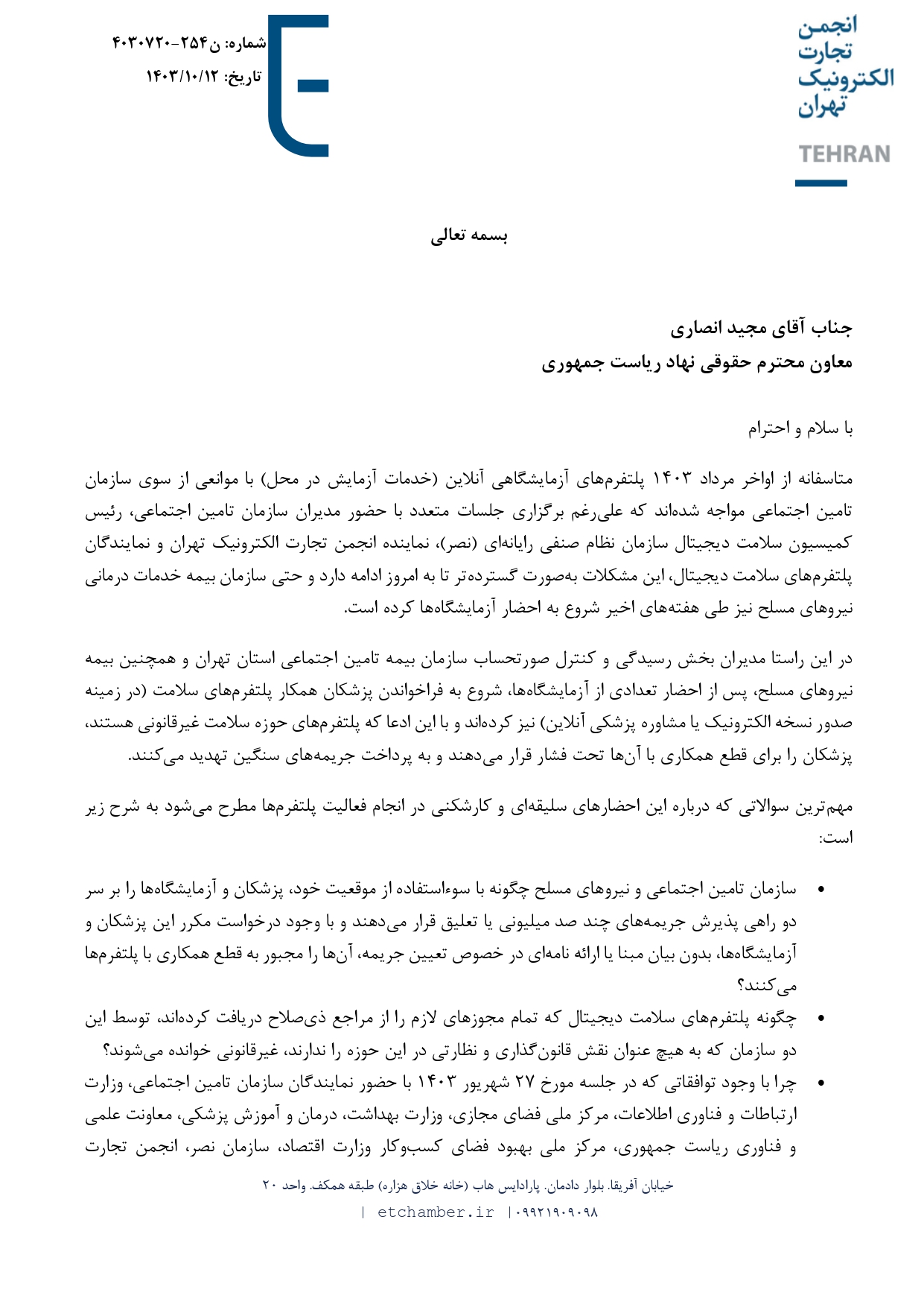 پس از اعتراض انجمن تجارت الکترونیک به اقدامات سازمان تأمین اجتماعی در محدودسازی فعالیت پلتفرمهای سلامت دیجیتال، معاونت حقوقی ریاست جمهوری اعلام کرد که این پلتفرمها نیازی به دریافت مجوز جداگانه برای ارائه خدمات آزمایشگاهی ندارند و آزمایشگاههای همکار آنها تنها باید دارای مجوز معتبر برای انجام آزمایش در محل باشند.
