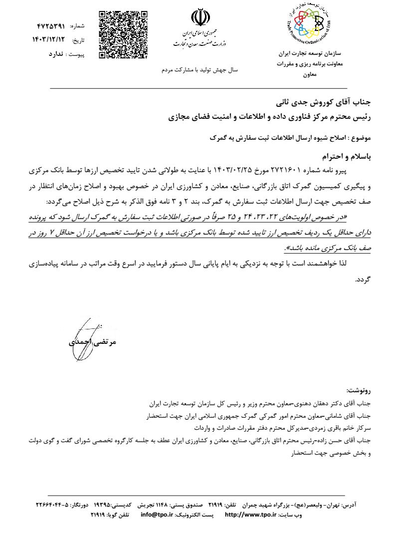 این بخشنامه پیرو نامه شماره ۲۷۲۱۶۰۱ مورخ ۱۴۰۳/۰۲/۲۵ با توجه به طولانی شدن تایید تخصیص ارزها توسط بانک مرکزی و پیگیری کمیسیون گمرک اتاق بازرگانی صنایع معادن و کشاورزی ایران در خصوص بهبود و اصلاح زمان‌های انتظار در صف تخصیص جهت ارسال اطلاعات ثبت سفارش به گمرک اصلاح می‌گردد.