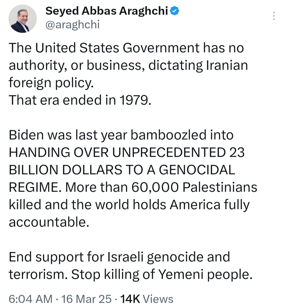 سید عباس عراقچی، سخنگوی وزارت امور خارجه ایران، در شبکه اجتماعی ایکس، به حمله آمریکا و انگلیس به صنعا در یمن و اظهارات دونالد ترامپ، رئیسجمهور آمریکا، واکنش نشان داد و خطاب به آمریکا نوشت: «دولت ایالات متحده هیچ حقی برای دیکته کردن به سیاست خارجی ایران ندارد. آن دوران در سال ۱۳۵۷ به پایان رسید. سال گذشته برای پرداخت رقم بیسابقه ۲۳ میلیارد دلار به یک رژیم نسلکش بهاشینگر شدند. بیش از ۶۰ هزار فلسطینی کشته شدند و جهان آمریکا را کاملاً مسئول میداند. به حمایت از نسلکشی و تروریسم اسرائیل پایان دهید و کشتار مردم یمن را متوقف کنید.»